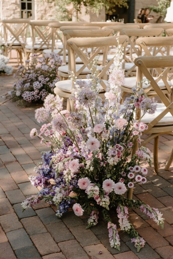 The wedding ceremony was held in front of the house, with beautiful floral pillars framing the scene. Big floral arrangements were placed along the aisle, adding a touch of elegance to the outdoor setting.