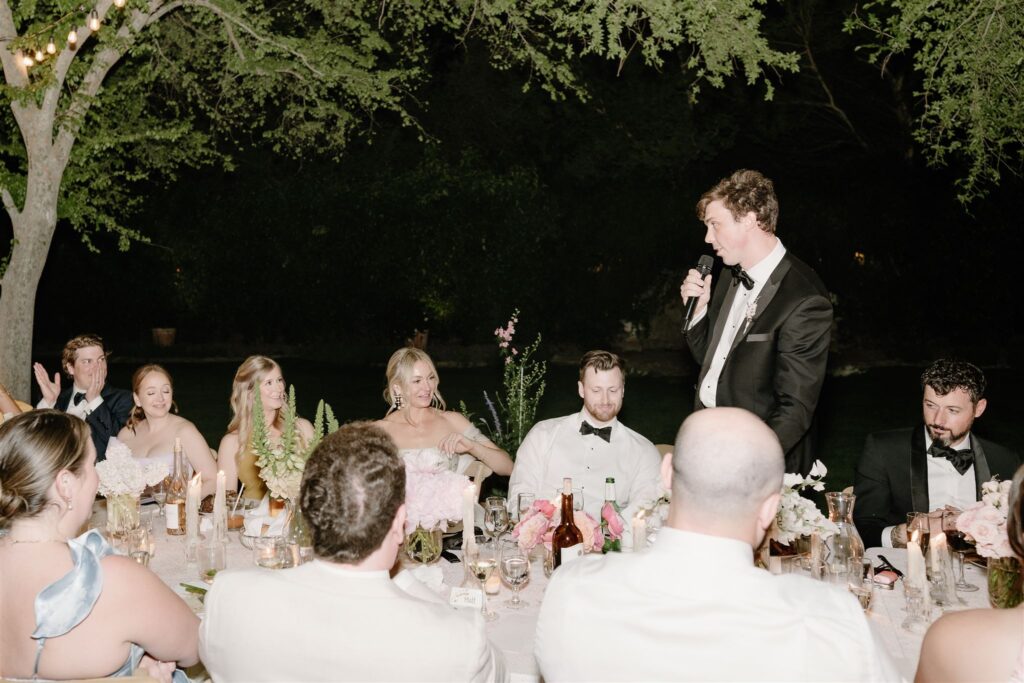 The dinner was held at a long rectangular table under romantic string lights and a candlelit setting. Additionally, the bride and groom sat among the guests, fostering a warm and intimate atmosphere.
