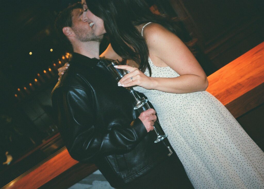 Matt and Mallory’s outfits were a perfect reflection of their style and the setting. Mallory’s light, flowy dress brought softness and movement against the darker tones of the bar, while Matt’s black leather jacket added a modern edge that complemented the space beautifully.