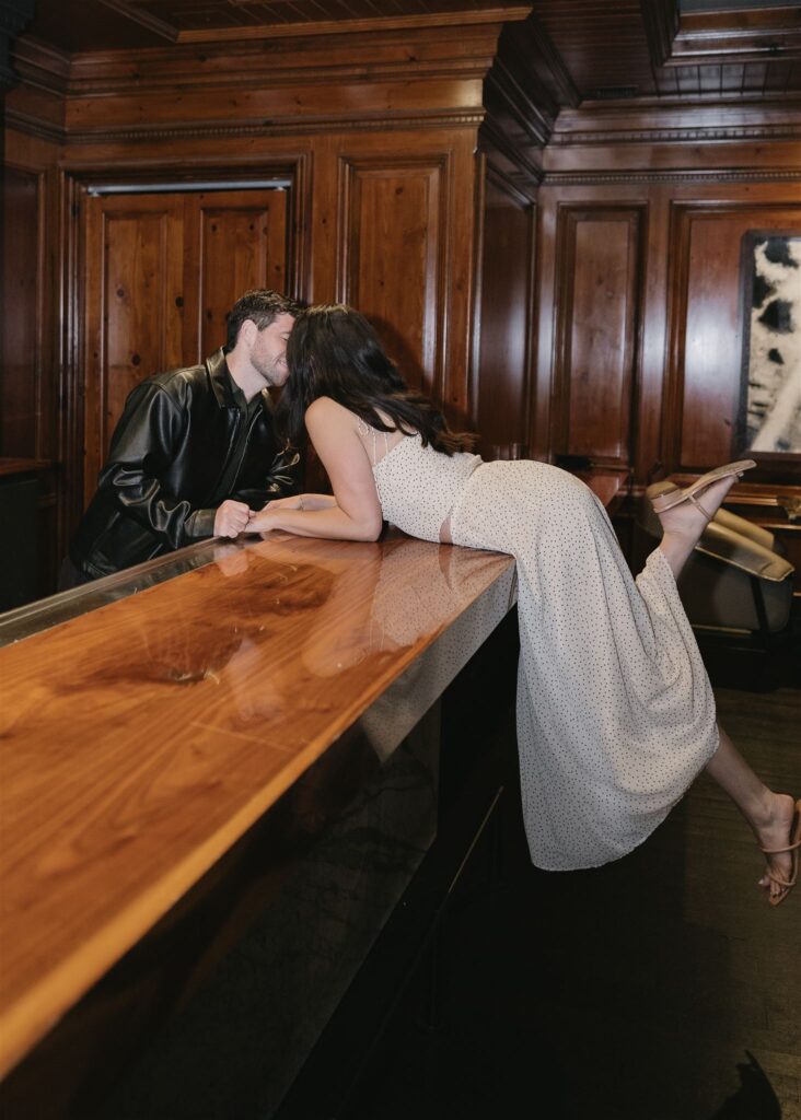 The Bee’s Knees bar adds character and depth, creating engagement photos that feel cozy, romantic, and effortlessly stylish.